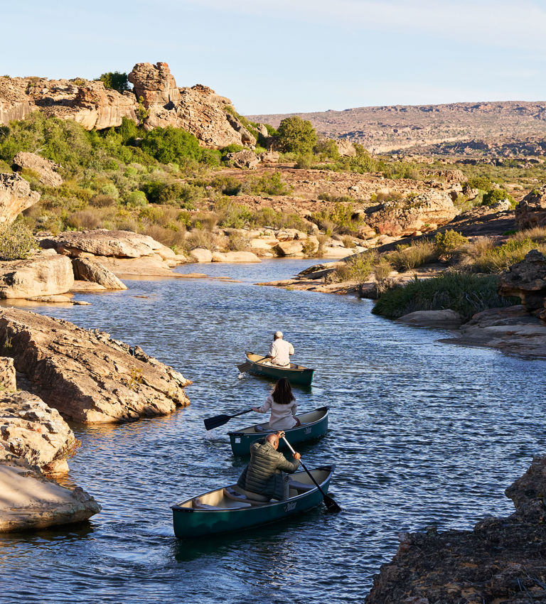 The tributaries of the perennial Olifants River flow through the sandstone formations of the reserve, delivering crystal-clear water to our large earthen-walled dam. Here, guided canoe experiences invite guests to paddle and swim beneath the bright blue sweep of African skies.